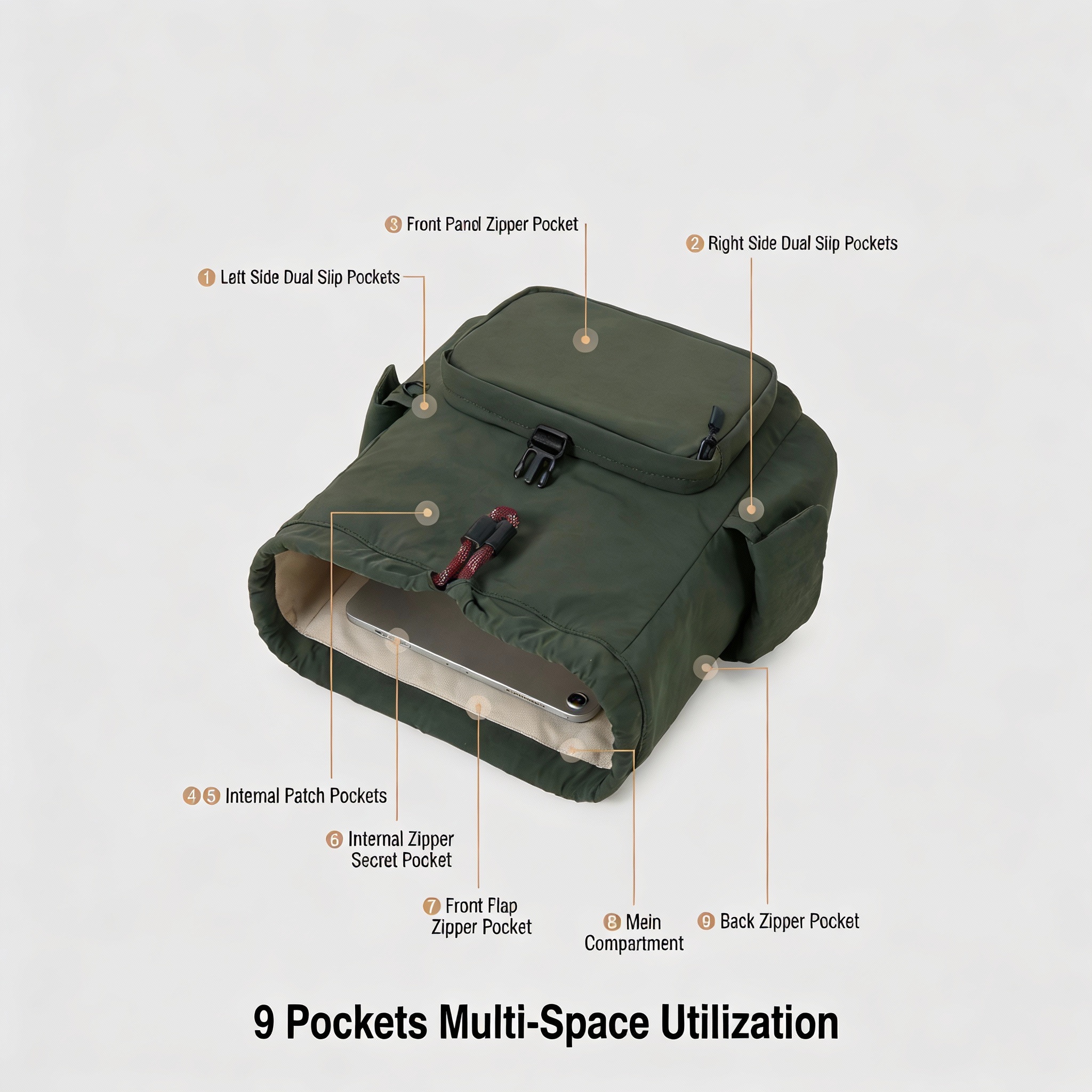 【9 Divided Storage Bags】Includes front and rear side pockets + hidden pockets, capable of holding a 10.9-inch tablet, organized without being messy