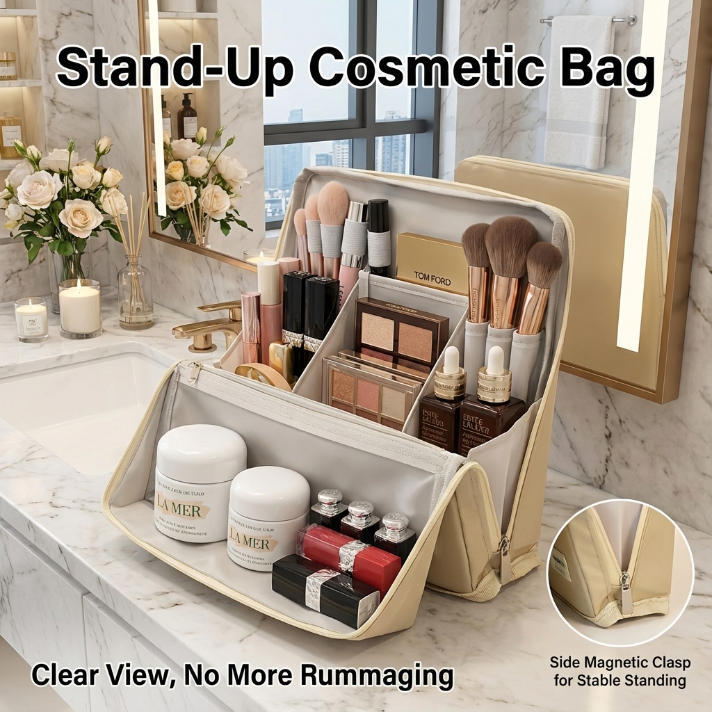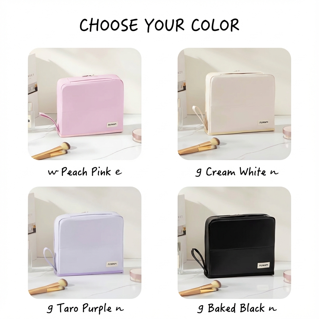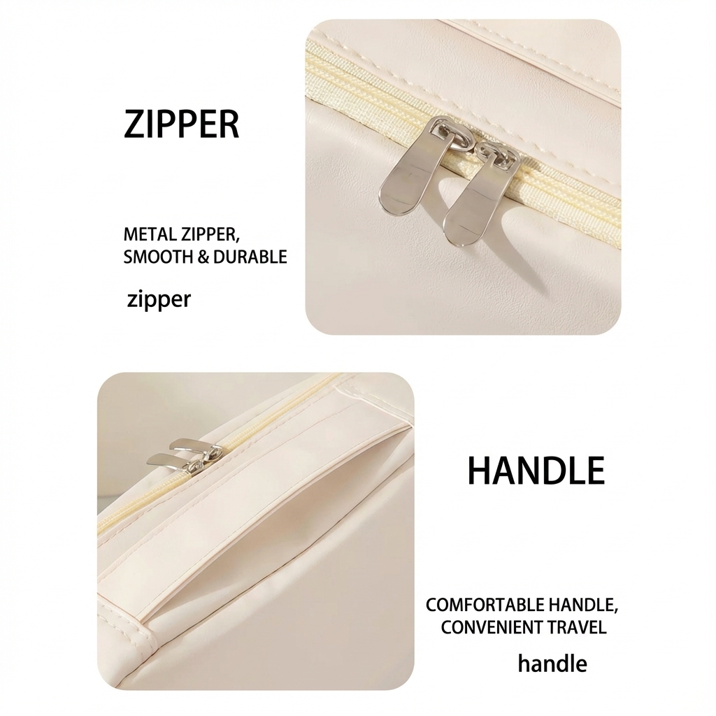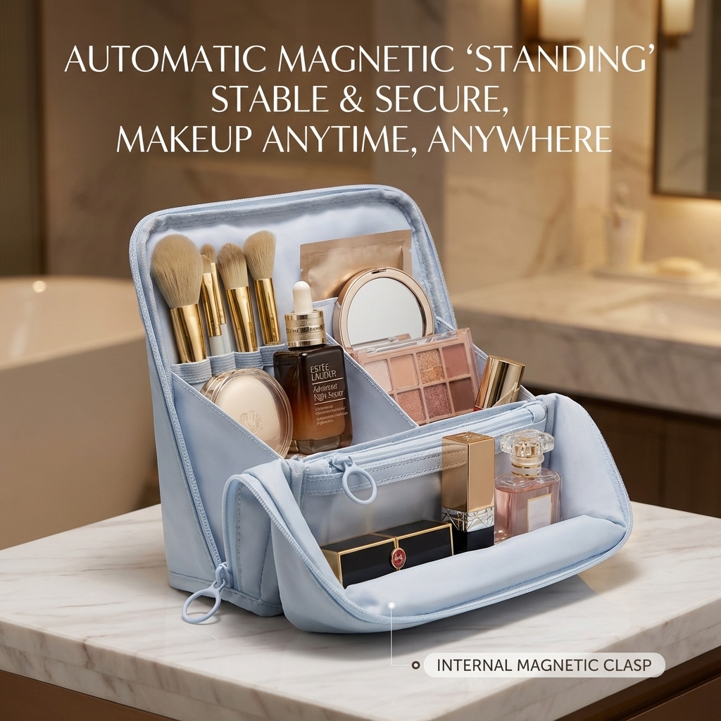 product description:This standing makeup bag is a must-have for makeup enthusiasts! It has a built-in magnetic snap that allows it to stand upright instantly and become a portable makeup station. It’s super convenient as you don’t have to hold it. The adjustable Velcro space + elastic brush holder + inner compartments make it easy to organize your makeup and skincare products without any clutter. It can hold 7 days’ worth of travel makeup and makeup tools, eliminating the hassle of carrying multiple bags. The smooth and durable metal zipper is comfortable to hold, and when folded, it can fit into a suitcase, making it suitable for both commuting and traveling. It’s practical and convenient.