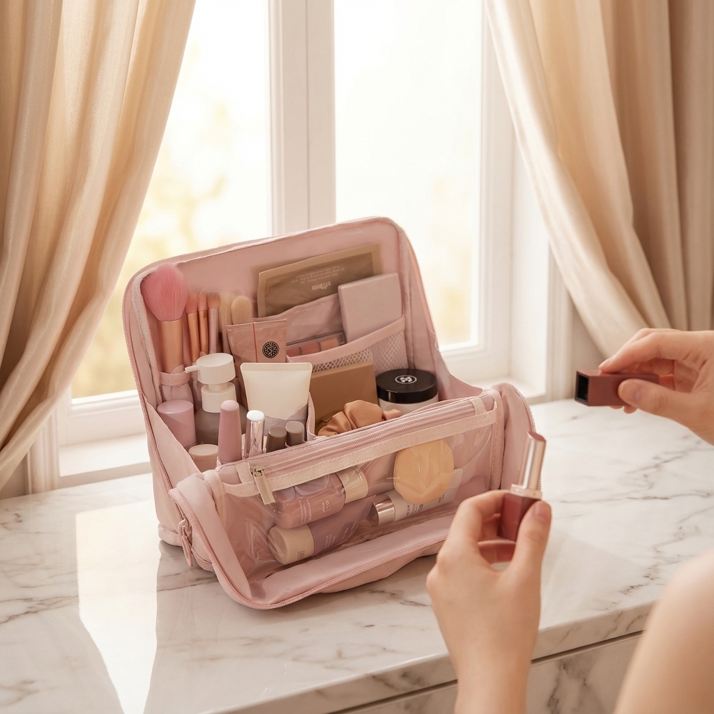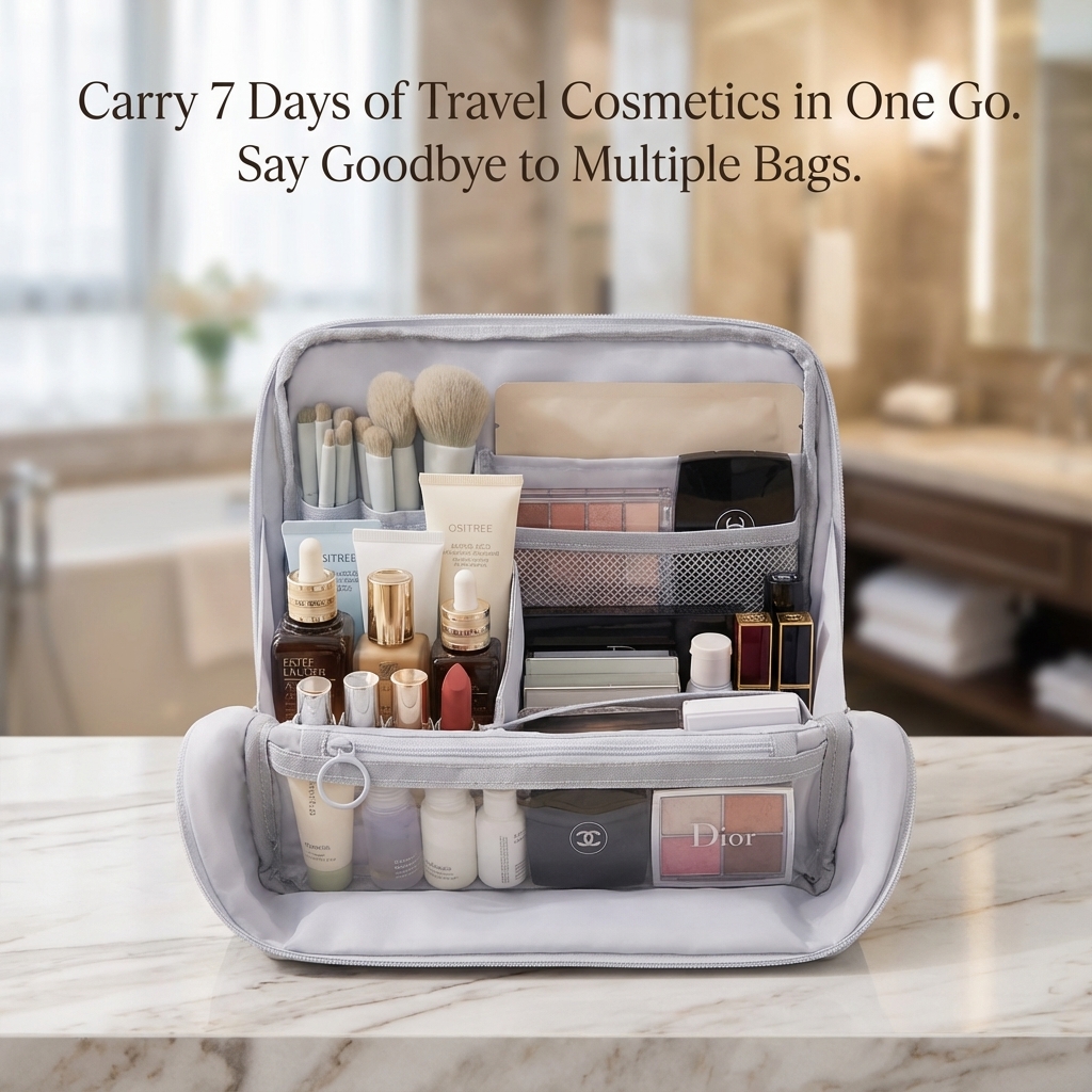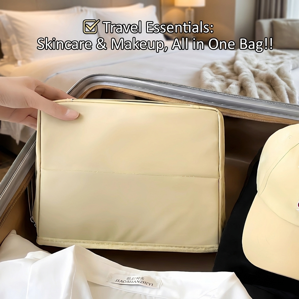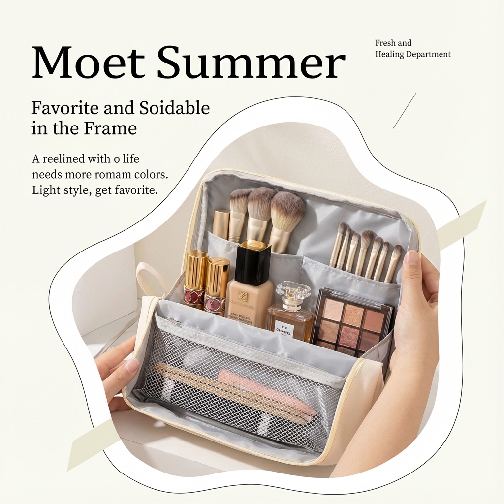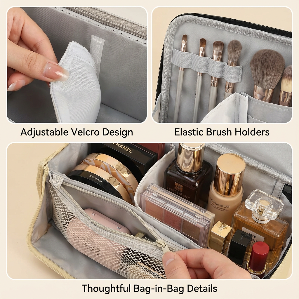 product description:This standing makeup bag is a must-have for makeup enthusiasts! It has a built-in magnetic snap that allows it to stand upright instantly and become a portable makeup station. It’s super convenient as you don’t have to hold it. The adjustable Velcro space + elastic brush holder + inner compartments make it easy to organize your makeup and skincare products without any clutter. It can hold 7 days’ worth of travel makeup and makeup tools, eliminating the hassle of carrying multiple bags. The smooth and durable metal zipper is comfortable to hold, and when folded, it can fit into a suitcase, making it suitable for both commuting and traveling. It’s practical and convenient.