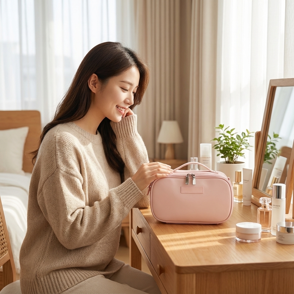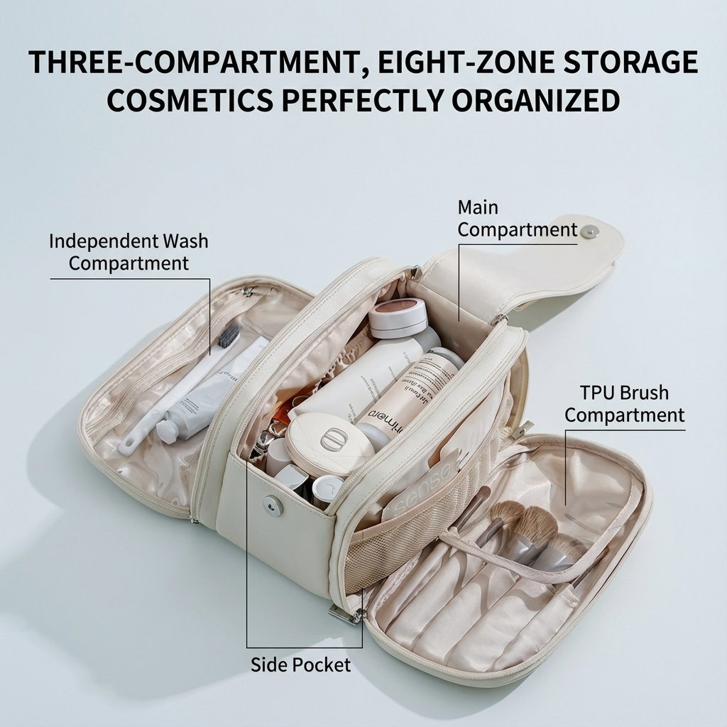 • A large capacity makeup storage bag with a double zipper design, featuring dry and wet separation, and having 8 separate compartments.