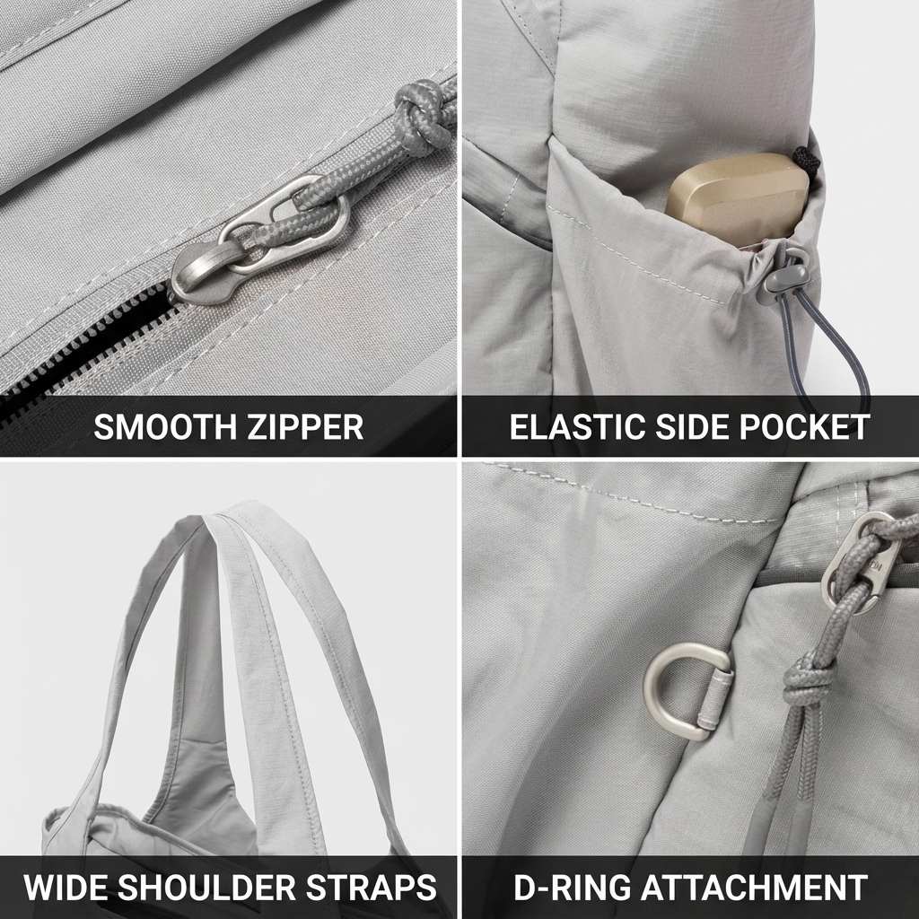 【Super Detailed and Thoughtful】Elastic side pockets for easy access, wide shoulder straps for greater comfort, smooth zipper + D-ring for practical enhancement.