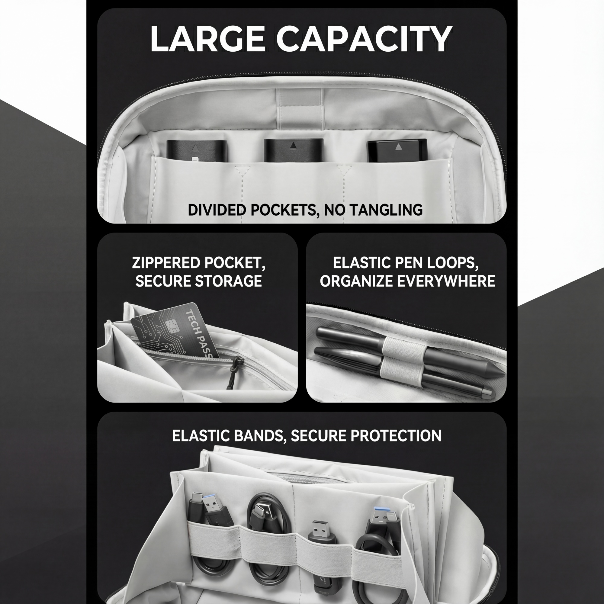 【Multiple Storage Spaces】Dividers + straps + pen loops, all digital accessories are neatly arranged.